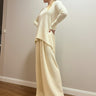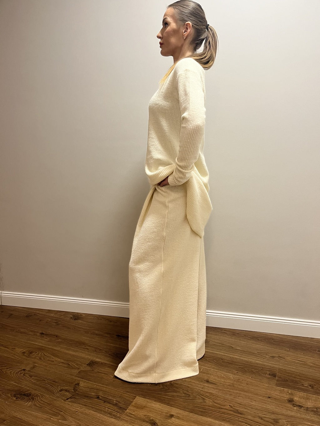Tento smotanový úpletový set spája minimalistickú eleganciu s výnimočným pohodlím. Mäkký, hrejivý materiál jemne obopne siluetu a vytvorí nadčasový look vhodný na každý deň. Top s dlhým rukávom a široké nohavice spolu tvoria outfit, ktorý pôsobí žensky, čistým dojmom a zároveň maximálne komfortne.